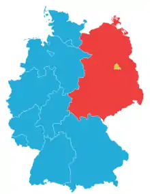 ألمانيا الشرقية تألفت في الأصل من خمس ولايات (براندنبورغ ومكلنبورغ-فوربومرن وساكسونيا وساكسونيا-أنهالت وتورينغن). في عام 1952 حُلّت هذه الولايات وتم تقسيم الشرق إلى 14 منطقة إدارية تسمى Bezirke. أُعلنت برلين الشرقية التي يسيطر عليها الاتحاد السوفييتي - على الرغم من أنها رسمياً لها نفس وضع برلين الغربية بعدم تبعيتها لأي ولاية - عاصمةً لألمانيا الشرقية وحيّها الخامس عشر.