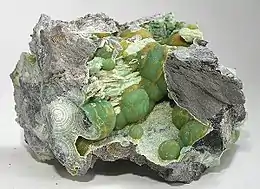 يمكن أن يوجد المعدن بعدة ألوان، أبرزها الأخضر أو الأخضر المصفر. ينتشر المعدن في أوروبا والولايات المتحدة وأستراليا.