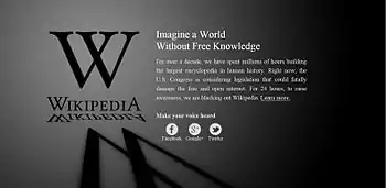 في 18 يناير 2012، شاركت ويكيبيديا الإنجليزية في سلسلة من الاحتجاجات المنسقة ضد قانونين مقترحين في كونغرس الولايات المتحدة - قانون وقف القرصنة عبر الإنترنت (SOPA) وقانون حماية الملكية الفكرية (PIPA) - بحجب صفحاتها لمدة 24 ساعات.[41] شاهد أكثر من 162 مليون شخص صفحة شرح التعتيم التي حلت محل محتوى ويكيبيديا مؤقتًا.[42][43]
