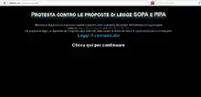 في 18 كانون الثاني/يناير 2012، تم تعطيل ويكيبيديا الإنجليزية لمدة 24 ساعة عقب صدور قرار من المساهمين احتجاجا على مشروعي قانونين يجري بحثها من قبل الكونغرس الأمريكي وهما قانون وقف القرصنة على الإنترنت وقانون حماية الملكية الفكرية. في ذلك اليوم، قامت ويكيبيديا الإيطالية بإعادة توجيه المستخدمين والزوار من الصفحة الرئيسية إلى صفحة سوداء للتعبير عن دعمهم للموسوعة الإنجليزية في ردة فعلها.