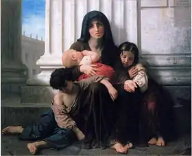 حتى في الأعمال التي تصور المتسولين، مال بوغيرو إلى المثالية، ما كان أحد أسباب اتهامه خلال حياته بالتكلف والتزييف. في لوحته الأسرة الفقيرة يظهر غموض واضح في معالجته للموضوع، ففي حين أن الصورة يجب أن تثير البؤس، رُسمت اللوحة بانسجام وتوازن عصر النهضة، ما يوحي بسمو هذا الموضوع، فيدرك الناظر أن الجميع في الصورة كامل النظافة وأن المرأة جميلة والطفل بين ذراعيها ممتلئ الجسم ذو لون وردي ويبدو بصحة جيدة تمامًا. في رأي إريكا لانغموير، على الرغم من روعة موضوع ورحمة وكرم الفنان، "العمل لا يقوم بدور تحقيق اجتماعي أو يدعو إلى العمل ضد الفقر"، كما اتضح للنقاد عندما عُرضت عليهم: "السيد بوغيرو يمكنه تعليم طلابه كيفية الرسم، لكنه لا يستطيع تعليمهم كيف يكون الأغنياء والناس من حولهم يعانون".[48][49]