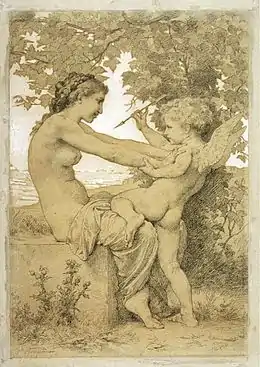 حيَّد بوغيرو القوة الجنسية للصبية في حالة تعامله مع الأساطير، وأظهرهم ككيوبيد وبالتالي جعلهم في نطاق لادنيوي. إنه أيضًا يستعرض تفضيله للنموذج الروماني لإله الحب، وهو نظريًا أقل في الطابع الجنسي من النموذج الإغريقي إيروس، والذي عادة ما يكون ذكرًا بالغًا فحلًا.[72] إن معالجة هذه الأعمال وحساسيتها وعاطفيتها تتعاون أيضًا لزيادة البعد عن الواقع. رسم الفنان كيوبيد عدة مرات، وذكر أن هذا غرضه الوفاء بحاجات السوق: "حيث أن المواد المتواضعة والدرامية والبطولية لا تُباع، ولمدى تفضيل الجمهور فينوس وكيوبيد، فأنا أرسمهما إرضاء للجمهور، وأنا أساسًا من المحبين لفينوس وكيوبيد".[71] في استكشاف أليس ماهون للوحته شابة تدافع عن نفسها ضد كيوبيد ذكرت حدوث هذا التحييد، والذي تجلى هنا في بنية اللوحة، حيث لاحظت أن الشابة تبتسم لإله الحب، لكنها تحاول إبعاده بذراعيها في ذات الوقت، كما لاحظت من الأجواء حولهما تلك البيئة الريفية الشاعرية تتجلى مجددًا، في حين قدم تفاصيل جذابة مثل جسم الشابة الجميل شبه العاري والأرداف وردية المكشوفة لإله الحب الصغير.[72]