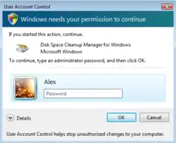 - التحكم بحساب المستخدم: هي تقنية أمنية جديدة تتيح للويندوز التعامل بكفاءة كمستخدم "عادي" بصلاحيات أقل. وقد كان هذا أمرًا يصعب تنفيذه في الإصدارات السابقة لويندوز، حيث أن حسابات المستخدمين المحدودة كانت محكومة جدًا وغير متوافقة مع عدد كبير من التطبيقات البرمجية. عندما يحتاج موقفٌ ما حقوق إدارية (بالإنجليزية: Administrative rights) فسيظهر للمستخدم طلب تأكيد هذا الموقف، أو سيظهر له طلب بإدخال كلمة سر أحد المدراء إذا لم يكن هو مديرًا. يتم طلب كلمة السر واسم حساب المدير في بيئة "سطح المكتب المؤمن" (بالإنجليزية: Secure Desktop)، حيث يختفي كل ما يظهر على الشاشة ويتعطل مؤقتًا، ويعرض واجهة الطلب المختلفة. ويتم هذا لكي يُمنع خداع تلك الواجهة أو لمنع تتبع نقرات الفأرة بواسطة التطبيق الذي قدم الطلب. تستطيع تقنية "التحكم بحساب المستخدم" أن توفر الملفات والسجل افتراضيـًا.