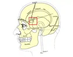 ![]() منظر جانبي للرأس، يُظِهر العلاقة بين العظام (يافوخ الجُنيح في الوسط مشاراً إليه) | |