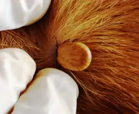 ![]() أنثى اليغموش البيضوي متعلقة بحزم وتتغذى على كلب. | |