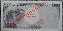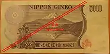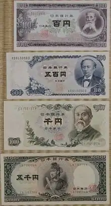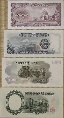 ![]() أوراق 100, 500, 1000, 5000 ين ياباني القديمة (الخلف) |