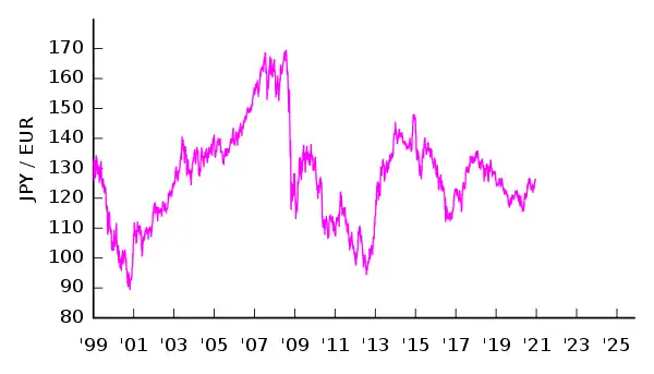 الصورة تمثل تغير اليورو مقارنة بالين، فبين سنتي 2001 و 1999, انخفض الفرق بين الين الياباني واليورو فأصبح بذلك: 1 يورو يعادل تقريبا 130 ينا يابانيا. وبسبب التطور في منطقة أوروبا، عاد اليورو بقوة في سنتي 2007و 2008, فصار 1 يورو يعادل تقريبا 166 ينا يابانيا. وخلال الأزمة، عاد اليورو للانخفاض، فصار بذلك 1 يورو يعادل 110 ينا يابانيا خلال سنة 2010.