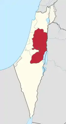 الضفة الغربية بالأحمر، وهي تضم التقسيم الإداري الإسرائيلي "يهودا والسامرة" بالإضافة إلى القدس الشرقية.