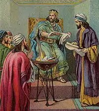 انتقد النبي إرميا سياسات الملك يهوياقيم، وأرسل له رسالة يدعوه إلى التوبة والالتزام بالشريعة، لكن يهوياقيم أحرقها.[7][8]