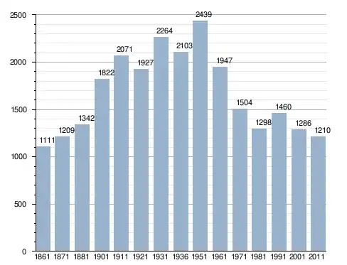 في سنة 1861 بلغ عدد السكان 1٬111 نسمة، وتطور العدد ليصل في سنة 2011 لـ 1٬210 نسمة.