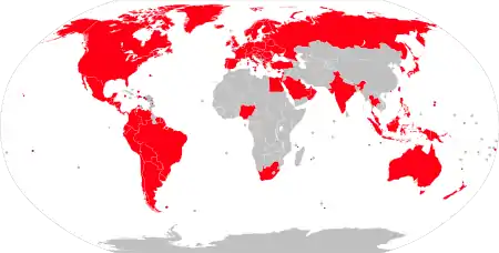 الخدمة متاحة في 100 دولة: ساموا الأمريكية، الأرجنتين، أروبا، أستراليا، النمسا، البحرين، بيلاروسيا، بلجيكا، بليز، برمودا، بوليفيا، البوسنة والهرسك، البرازيل، جزر فيرجن البريطانية، بلغاريا، كندا، جزر كايمان، تشيلي، كولومبيا، كوستاريكا، كرواتيا، قبرص، جمهورية التشيك، الدنمارك ، جمهورية الدومينيكان، إكوادور، مصر، السلفادور، إستونيا، فنلندا، فرنسا، غيانا الفرنسية، بولينيزيا الفرنسية، ألمانيا، اليونان، جوادلوب، غوام، غواتيمالا، هندوراس، هونغ كونغ، المجر، أيسلندا، الهند، إندونيسيا، أيرلندا، إسرائيل، إيطاليا، اليابان، الكويت، لاتفيا، لبنان، ليختنشتاين، ليتوانيا، لوكسمبورغ، ماليزيا، مالطا، المكسيك، هولندا، نيوزيلندا، نيكاراغوا، نيجيريا، مقدونيا الشمالية، جزر ماريانا الشمالية والنرويج وعمان وبنما وبابوا غينيا الجديدة وباراغواي وبيرو والفلبين وبولندا والبرتغال وبورتوريكو وقطر ورومانيا وروسيا ورواندا وساموا والمملكة العربية السعودية وصربيا وسنغافورة وسلوفاكيا وسلوفينيا وجنوب إفريقيا وكوريا الجنوبية واسبانيا والسويد وسويسرا وتايوان وتايلاند وترينيداد وتوباجو وتركيا وجزر تركس وكايكوس وأوكرانيا والإمارات العربية المتحدة والمملكة المتحدة والولايات المتحدة وجزر فيرجن الأمريكية وأوروغواي وفنزويلا.[12][13][14][15]
