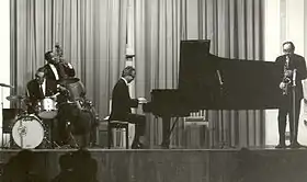 ![]() رايت (أعلى اليسار ممسكٌ بالكمان الأجهر) مؤديًا إحدى العروض سنة 1967 | |