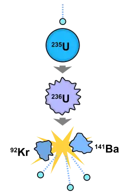 لاحظ فريق بقيادة إنريكو فيرمي في عام 1934 أن قذف اليورانيوم بالنيوترونات ينتج اضمحلال أشعة بيتا مما ينتج عنه اتشطار الإلكترون أو البوزيترون من العناصر المنتجة.[16] في البداية، سُمّي منتج الانشطار خطءًا بعناصر جديدة ذات أرقام ذرية 93 و94، حيث قام عميد كلية روما أورسو ماريو كوربينو بتسمية العنصرين بالأوديوم والهسبيريوم على التوالي.[17][18][19][20] أدت التجارب التي أجراها أوتو هان وفريتز شتراسمان[16] في مختبر هان في برلين إلى اكتشاف قدرة اليورانيوم على الانشطار إلى عناصر أخف وزنًا وإصدار طاقة كبيرة. نشرت ليز مايتنر وابن أختها الفيزيائي أوتو روبرت فريش التفسير المادي في فبراير 1939 وأطلقوا عليه اسم الانشطار النووي.[21] وبعد فترة وجيزة، افترض فيرمي أن انشطار اليورانيوم قد يطلق ما يكفي من النيوترونات للحفاظ على التفاعل الانشطاري. وجاء تأكيد هذه الفرضية في عام 1939، حيث وُجد في وقت لاحق أن ما يقرب من 2.5 نيوترون يتم تحريرها عن طريق انشطار كل ذرة من اليورانيوم -235. حثّ فيرمي ألفريد أو سي نير على فصل نظائر اليورانيوم من أجل تحديد العنصر القابل للانشطار. وفي 29 فبراير 1940، استخدم نير أداة صنعها في جامعة مينيسوتا لفصل أول عينة في العالم من اليورانيوم -235 في العالم في مختبر تيت. بعد إرسال المسرع دوراني بالبريد إلى جامعة كولومبيا، أكد جون دانينج أن العينة هي المادة الانشطارية المعزولة في 1 مارس.[22] ووجد المزيد من العمل أن نظير اليورانيوم 238 الأكثر شيوعًا يمكن أن يتحول نوويًا إلى البلوتونيوم والذي يعتبر قابل للانشطار أيضًا بالنيترونات الحرارية مثل اليورانيوم -235. أدت هذه الاكتشافات في دول عديدة لبدء العمل على تطوير الأسلحة النووية والطاقة النووية.