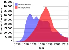 خلال الحرب الباردة بين الاتحاد السوفييتي والولايات المتحدة، تم تكديس مخزونات ضخمة من اليورانيوم وعُثر على عشرات الآلاف من الأسلحة النووية باستخدام اليورانيوم المخصب والبلوتونيوم المصنوع من اليورانيوم. منذ تفكك الاتحاد السوفياتي في عام 1991، تم تخزين ما يقدر بـ 600 طن قصير (540 طن متري) من اليورانيوم عالي التخصيب المستخدم في صنع الأسلحة (وهو ما يكفي لصنع 40.000 رأس حربي نووي) في مرافق غالًبا ما كانت خاضعة لحراسة غير كافية في الاتحاد الروسي والعديد من الدول السوفيتية السابقة الأخرى. واعترضت الشرطة في آسيا وأوروبا وأمريكا الجنوبية في 16 مناسبة على الأقل في الفترة من 1993 إلى 2005 على شحنات اليورانيوم أو البلوتونيوم المستخرج من القنابل ومعظمها من مصادر سوفييتية سابقة. ومن عام 1993 إلى عام 2005، أنفق برنامج حماية المواد والمراقبة والمحاسبة الذي تديره الحكومة الفيدرالية للولايات المتحدة حوالي 550 مليون دولار أمريكي للمساعدة في حماية مخزون اليورانيوم والبلوتونيوم في روسيا.[37] استُخدمت هذه الأموال للتحسينات الأمنية في مرافق البحث والتخزين. وذكرت مجلة ساينتفيك أمريكان في فبراير / شباط 2006 أنه في بعض المرافق، تألف الأمن من أسوار متصلة بالسلسلة والتي كانت في حالة سيئة للغاية. ووفقًا لإحدى المقالات، كان أحد المرافق يخزن عينات من اليورانيوم المخصب لصنع الأسلحة في خزانة مكنسة قبل مشروع التحسين. وكان آخر يتابع مخزونه من الرؤوس الحربية النووية باستخدام بطاقات فهرسة محفوظة في صندوق الأحذية.[38]