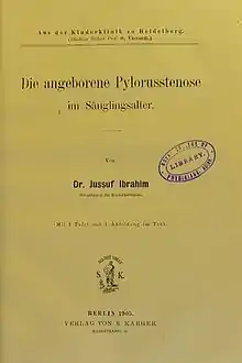 - Ibrahim, Jussuf (1905). Die angeborene Pylorusstenose im Säuglingsalter [عن تضيُّق البواب التضخمي الولادي عند الأطفال] (باللغة الألمانية) (الطبعة الأولى). Berlin: Verlag von S. Karger. مؤرشف من الأصل في 14 فبراير 2020. الوسيط
