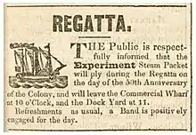 |CitationClass=تم تجاهله (مساعدة) نسخة محفوظة 15 December 2020 at archive.fo - "Regatta". Sydney Herald. 30 January 1837. صفحة 2. الوسيط