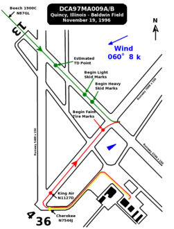 يونايتد إكسبريس الرحلة 5925 طائرة بيتشكرافت 1900C كانت تحمل علي متنها 10 ركاب وطياران بدون مضيفات جويين في رحلة طيران من شيكاغو إلي كوينسي عبر برلنغتون في ليلة 19 نوفمبر 1996 وبينما كانت طائرة يونايتد إكسبريس تقترب للهبوط في مطار كوينسي المحلي علي المدرج 13 كانت طائرة بيتشكرافت 65-A90 كينغ إير كانت تحمل علي متنها مدرب طيران وطالبة تتعلم الطيران تستعد للإقلاع علي المدرج 4 وخلف طائرة بيتشكرافت 65-A90 كينغ إير كانت توجد طائرة بايبر بيه إيه-28 شيروكي كانت تحمل علي متنها مدرب طيران وطالب يتعلم الطيران تستعد للإقلاع بعد طائرة بيتشكرافت كينغ إير وكان مطار كوينسي المحلي بدون برج لمراقبة الحركة الجوية لإرشاد الطائرات وكان علي الطيارين أن يتبادلوا الاتصالات بينهما في المطارات بدون برج لمراقبة الحركة الجوية.