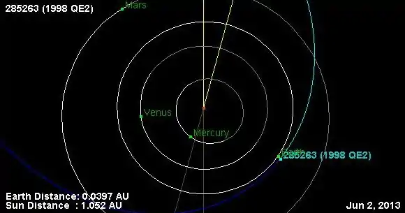 في يوم 31 مايو 2013 اقترب الكويكب 1998 كيو إي2 البالغ قطره نحو 7 و2 كيلومتر من الأرض حتى اصبح على بعد 8و5 مليون كيلومتر (وهي مسافة أبعد من القمر 15 مرة). وكان ذلك في تمام الساعة 20:59 طبقا للتوقيت العالمي المنسق.,[5] وكان هذا هو أقرب مسار للكويكب من الأرض خلال القرنين القادمين من الزمان. وهو عاكس جيد لأشعة الرادار. والتقطع مرصد جولدستون لاتصالات أعماق الفضاء بين يومي 30 مايو و 9 يونيو 2013. وعلى أقرب بعد للكويكب من الأرض كانت درجة لمعانه 11 قدر ظاهري، أي كانت رؤيته تحتاج إلى استخدام مقراب صغير.[1]