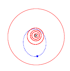 ![]() مدار كويكب 1036 غانيميد (باللون الأزرق) مقارنةً بمدارات الكواكب الأخرى (بالأحمر) والشمس (بالأسود). إن آخر المدارات الظاهرة بالصُّورة هو مدار المشتري، ولا تظهر باقي الكواكب. | |