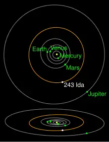 243 إيدا (/ˈaɪdə/) هو كويكب صغير يتخذ مداراً حول الشمس، ينتمي إلى عائلة كورونيس وهي عائلة من الكويكبات تقع في حزام الكويكبات بين المريخ والمشتري.[11] اكتشف 243 إيدا في 29 أيلول 1884 من قبل الفلكي النمساوي يوهان بليسا،[12] وهو الكويكب رقم 45 الذي يكتشفه. وسمي باسم حورية من الأساطير اليونانية. من قبل الفلكي الهاوي مورس فون كافنر.[13][14] الملاحظات وعمليات الرصد التلسكوبية التي أجريت فيما بعد صنفت إيدا بأنه كويكب من النوع أس وهو النوع الأكثر عددا في حزام الكويكبات الداخلي. ومثل كل الكويكبات في حزام الكويكبات، فإن مدار إيدا يكمن بين المريخ والمشتري. وتستغرق فترته المدارية حول الشمس 4.84 سنة، وفترة دورانه حول نفسه 4.63 ساعة ومتوسط قطر إيدا 31.4 كم وهذا يعادل (19.5 ميل).