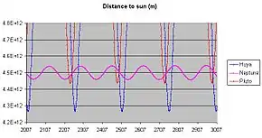 ![]() مخطط بياني للمسافة بين الشمس و نبتون. بلوتو والكوكب قزم المرشح هويا على مدى فترة أكبر من 1،000 سنة. وهو يبين كيف يكون هويا أقرب إلى الشمس من بلوتو. كل من بلوتو و هويا في رنين مداري 2: 3 مع نبتون. | |