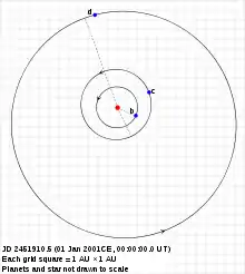 مخطط لنظام 47 الدب الأكبر الكوكبي. (47 الدب الأكبر d) هو الكوكب الأبعد.