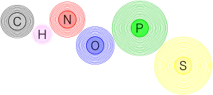 الاختصار CHNOPS (شنوبس) هي الحروف الأولى للكلمات اللاتينة الخاصة بـ: الكربون، الهيدروجين، الأكسجين، النيتروجين، الفسفور، الكبريت وتمثل أكثر العناصر الكيميائية أهمية وتشكل توليفاتها التساهمية معظم الجزيئات البيولوجية في الأرض.[1] جميع هذه العناصر غير معدنية (لا فلزية)، يتواجد الكبريت في الحمضين الأمينيين سيستئين وميثيونين.[2] يتواجد الفوسفور في اللبيدات الفوسفورية، وهي قسم من اللبيدات ومكون أساسي لجميع الأغشية الخلوية وذلك لقدرتها على تكوين ليبيدات ثنائية الطبقة قادرة على إبقاء الأيونات، البروتينات في الأمكنة التي تحتاجها لعمل الخلية السليم، ومنعها من الانتشار إلى مناطق قد تحدث فيها أضرارا. مجموعات الفوسفات مكونات أساسية للعمود الفقري للأحماض النووية ومطلوبة لتكوين الـATP وهو المركب الرئيسي المُستخدَم للحصول على الطاقة للقيام بالعمليات الخلوية المختلفة في جميع الكائنات الحية.[3]