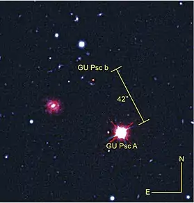 ![]() صورة مركبة لنجم GU الحوت وكوكب GU الحوت b فالضوء المرئي من مرصد جيميني الجنوبي وبالأشعة تحت الحمراء من تلسكوب كندا-فرنسا هاواي. | |||