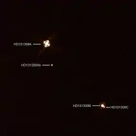 ![]() وتظهر هذه الصورة المركبة الكوكب خارج المجموعة الشمسية و المكتشف حديثا HD 131399Ab و النظام النجمي الثلاثي HD 131399. (الكوكب يظهر بشكل أكثر إشراقا بكثير مما هو علية في الواقع بالمقارنة مع النجوم). | |||
