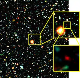 |CitationClass=تم تجاهله (مساعدة); الوسيط|separator=تم تجاهله (مساعدة)CS1 maint: ref=harv (link) - Iye, Masanori; Ota, Kazuaki; Kashikawa, Nobunari; Furusawa, Hisanori; Hashimoto, Tetsuya; Hattori, Takashi; Matsuda, Yuichi; Morokuma, Tomoki; Ouchi, Masami (2006), "A galaxy at a redshift z = 6.96", Nature, 443 (7108): 186–188, arXiv:astro-ph/0609393v1, Bibcode:2006Natur.443..186I, doi:10.1038/nature05104, PMID 16971942 الوسيط