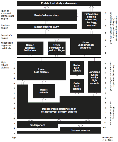 الصورة على اليمين جدول يحدد نظام التعليم في الولايات المتحدة. يوضح الجدول تقدم النظام التعليمي بدءاً من رياض الأطفال الأساسية إلى نظام الصف الثاني عشر ثم استمرار في التعليم ما بعد الثانوي. يتم تعريف رياض الأطفال حتى الصف الرابع عشر على أنها روضة للأطفال إلى الثاني عشر بالإضافة إلى عامين من التعليم بعد الثانوي حيث تم تلقي التدريب من المؤسسات التقنية المهنية أو المجتمع أو الكليات الصغيرة تشير أرقام ك إلى سنوات الدراسة وتستمر في التقدم صعودًا وفقًا للدرجة المطلوبة. [7]