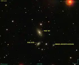 | رمز الفهرس | NGC 161 (الفهرس العام الجديد )[1] PGC 2131 (فهرس المجرات الرئيسية )[1] 2MASX J00353394-0250555 (Two Micron All Sky Survey, Extended source catalogue )[1] MCG-01-02-036 (فهرس المجرات الموروفولوجي )[1] GSC 04675-00665 (دليل النجم المفهرس )[1] 6dFGS gJ003533.9-025055 (6dF Galaxy Survey )[1] NPM1G -03.0032 (Lick Northern Proper Motion Survey Galaxy Calalogue )[1] LEDA 2131 (ليون-ميودون قاعدة بيانات خارج المجرة )[1] |
