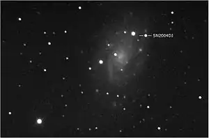 في أواخر عام 2004 نشرت أخبار عن اكتشاف مستعرين اعظمين في تلك المجرة : مستعر أعظم مخادع التي وصلت شدة لمعانها 16 في أوج نشاطها، وSN 2004dj.