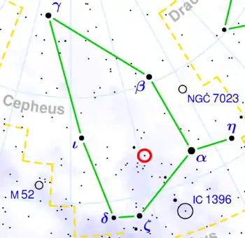 - Size, mass and luminosity estimates are all considerably uncertain due to insufficient knowledge of the Cephei star system: Professor Kaler writes "in truth we really do not know". Its distance cannot be measured from parallax, instead it is derived from its assumed membership in the Cepheus OB2 اتحاد نجمي, but this is also not certain. Other methods give a range of sizes between 1000 and 2200 that of the Sun, but these too are confounded by the fact that the star is not spherical, which leads to overestimates. (J. Kaler)