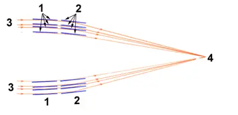 1 : المرايا معدنية رقيقة في شكل القطع المكافي ، - 2 : مرايا في شكل القطع الزائد لأشعة إكس 3 الساقطة - 4 : نقطة البؤرة.